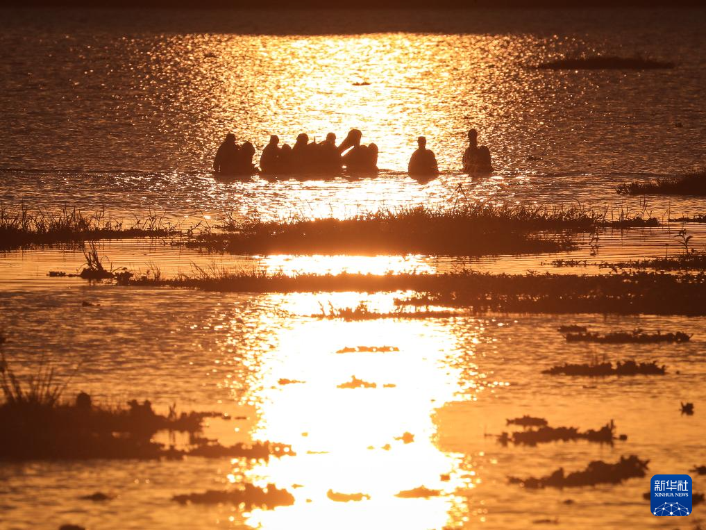 4月27日,在肯尼亚卡贾多县,鹈鹕在夕阳时分的安博塞利国家公园里活动。