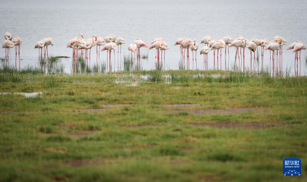 4月28日,在肯尼亚卡贾多县,火烈鸟在安博塞利国家公园里栖息。