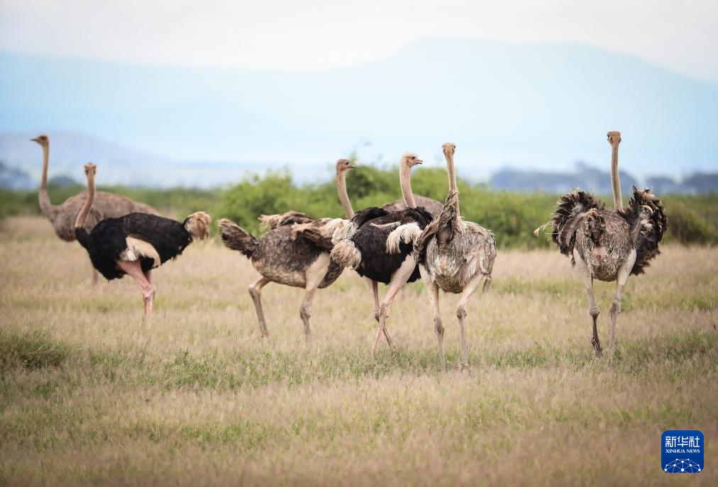 4月28日,在肯尼亚卡贾多县,鸵鸟在安博塞利国家公园里活动。