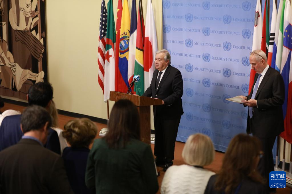 4月30日,在位于纽约的联合国总部,联合国秘书长古特雷斯举行记者见面会,敦促以色列和巴勒斯坦伊斯兰抵抗运动(哈马斯)就人道主义停火等达成协议。新华社记者 谢锷 摄