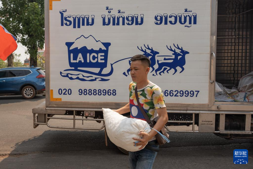 5月1日,一名工人在老挝首都万象街边搬运冰块。