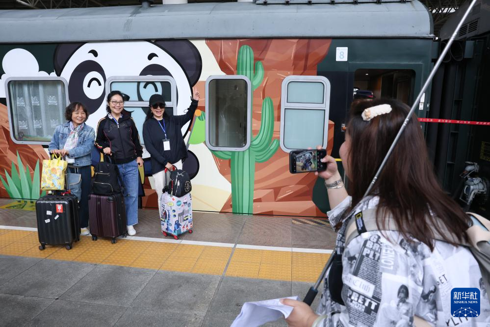 5月8日,旅客在“熊猫专列”前拍照留念。