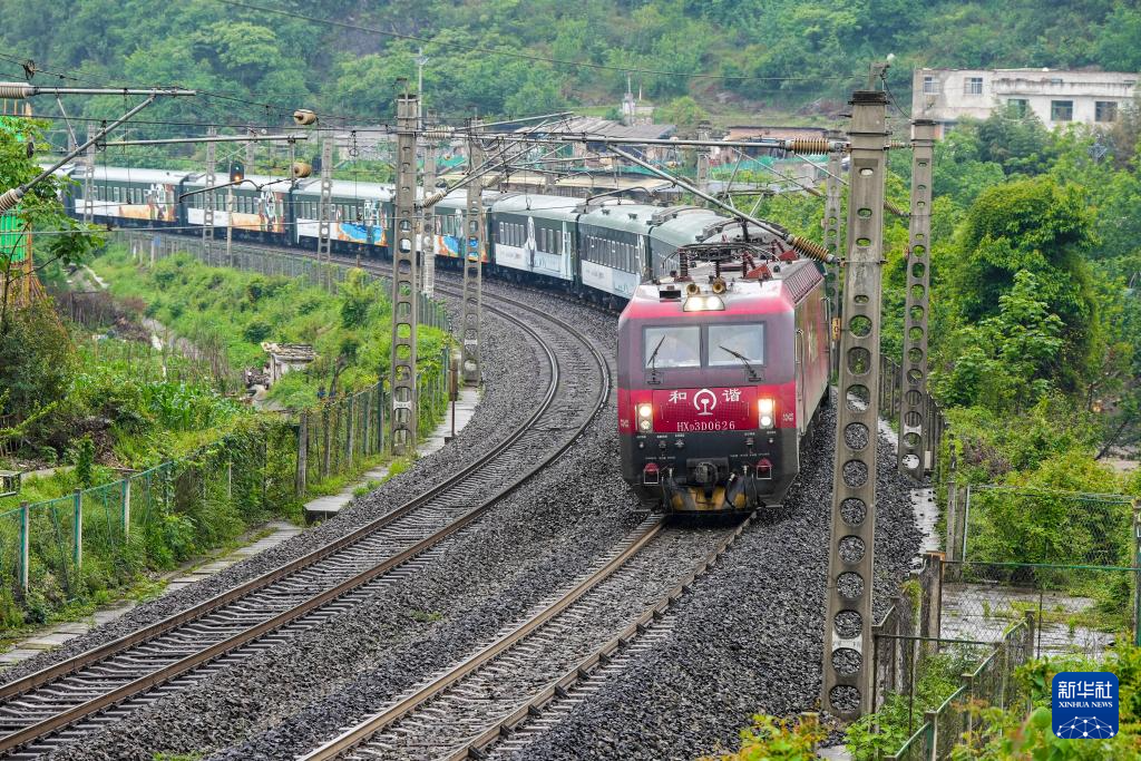 5月8日,“熊猫专列”Y477次列车行驶在位于贵州省贵阳市花溪区的沪昆铁路上。