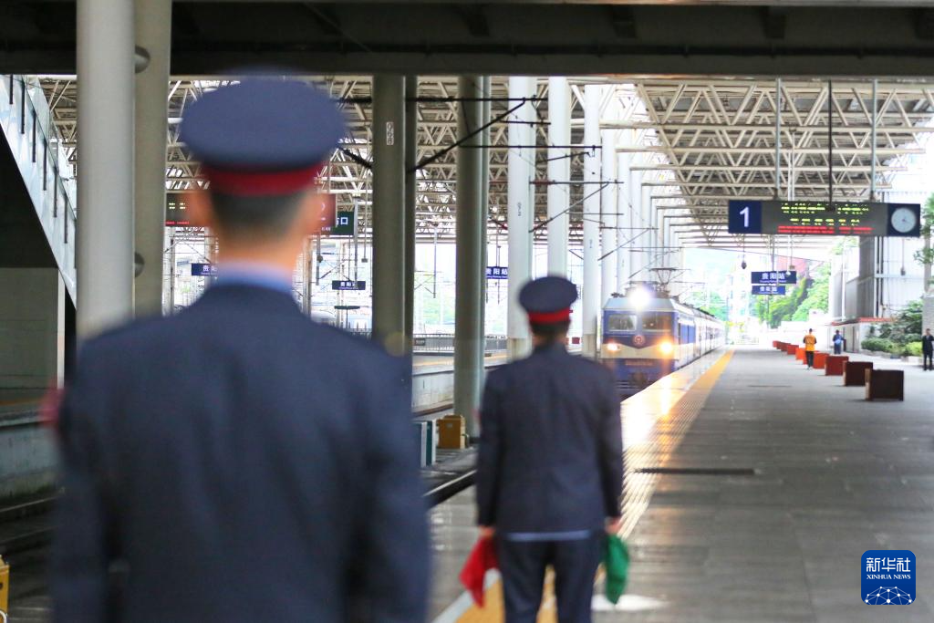 5月8日,在贵阳火车站站台上,铁路工作人员等待“熊猫专列”进站