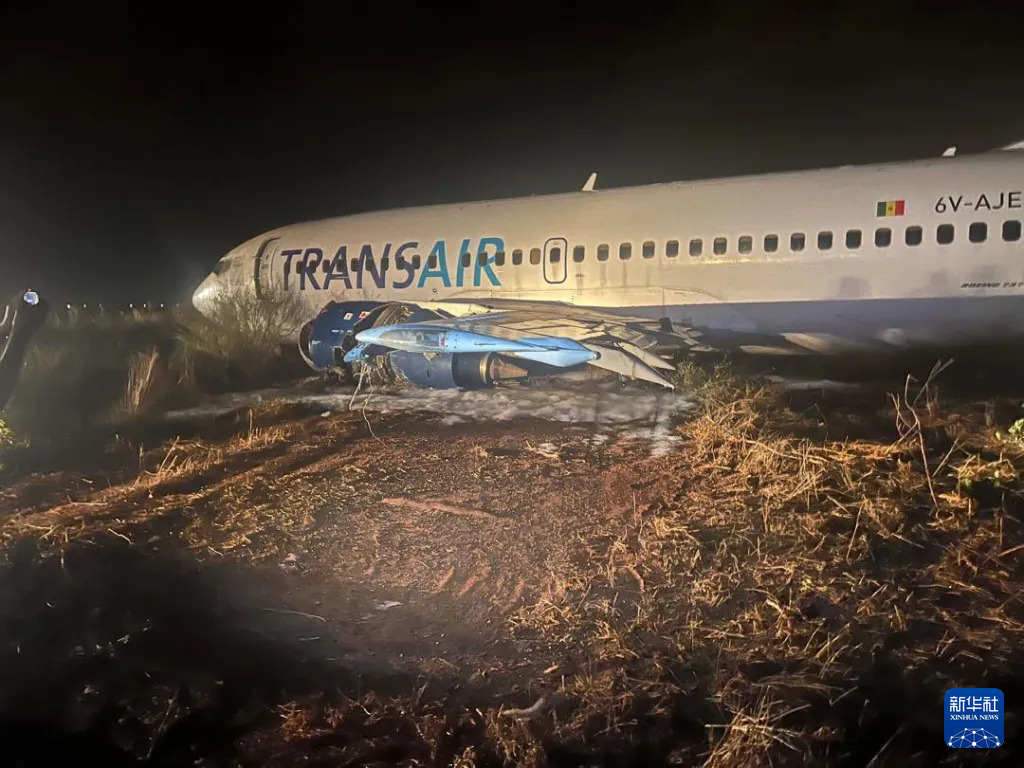 这是5月9日凌晨在塞内加尔首都达喀尔布莱兹·迪亚涅国际机场拍摄的冲出跑道的客机。新华社/塞内加尔通讯社