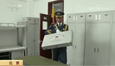 撤离前,仪仗方队的三个旗组,将受阅的党旗、国旗、军旗仔细地叠好,移交上级。