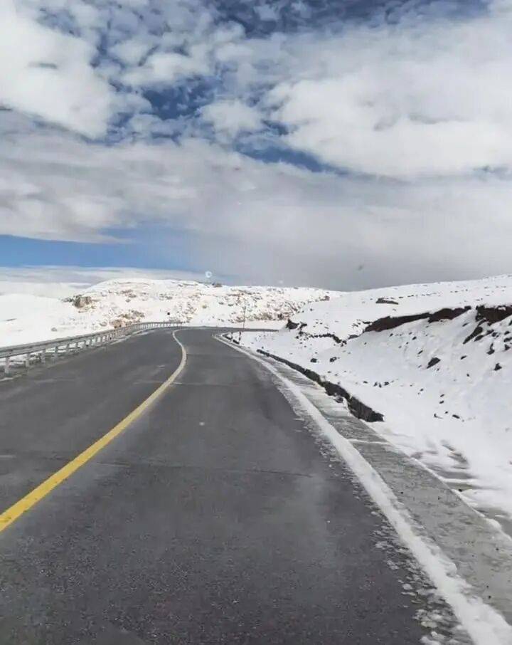 网友发布的视频显示,前往纳木措的公路上有不少雪,汽车行驶速度较慢,公路两侧的山坡上已盖了厚厚一层积雪。镜头拉远,每座山都变成了“雪山”,和天空的云朵相接,十分美丽。