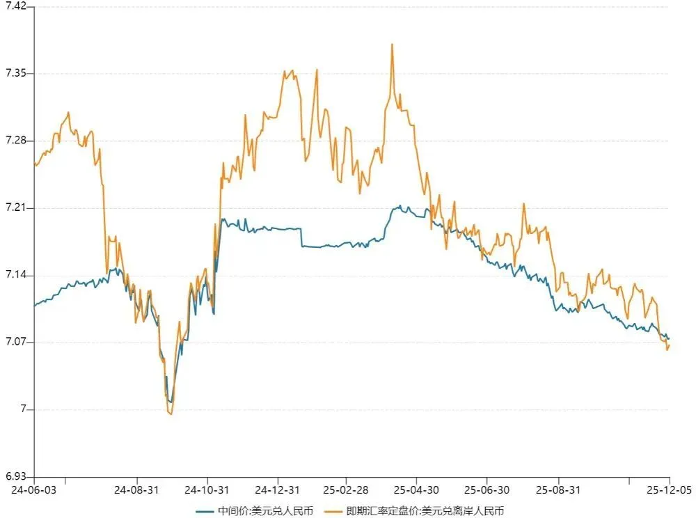 2025年4月美国“对等关税”以来,离岸人民币从高点7.38附近,一路升值至今,价格稳定在7.07区间。正因如此,人民币创下14个月新高。