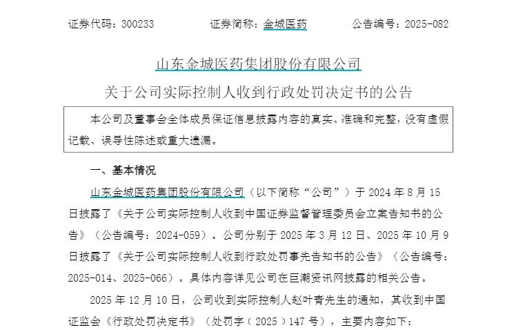 此次处罚决定书的落地,标志着金城医药实控人被调查事件的终结,回溯了整个事件的前后经过,2024年8月15日,金城医药首次披露赵叶青收到证监会《立案告知书》;2025年3月和10月,两次《行政处罚事先告知书》陆续送达,操纵证券市场的调查事实不断清晰。直至12月10日,处罚决定正式出台,整个调查、听证周期历时一年多。