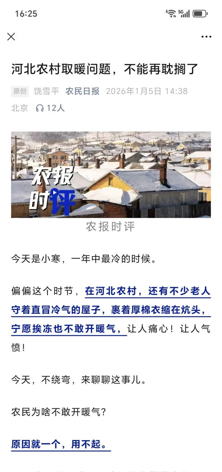 1月5日,小寒当日,《农民日报》在“农报时评”栏发表了原创评论《河北农村取暖问题,不能再耽搁了》。