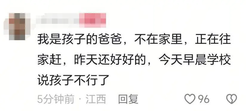 当天中午,该账号在视频评论区更新一条留言:“大家好,我是孩子的爸爸,孩子昨天好好的,今天早晨学校说孩子不行了,说话的是我姐夫,我正在往家赶。”记者试图联系孩子家长,暂未获得回复。
