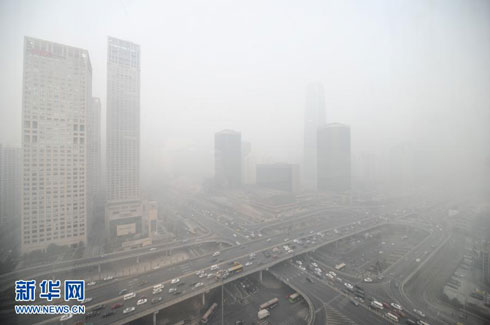 北京东三环国贸桥附近的建筑和道路(1月16日摄)。当节日喜庆的硝烟散尽,全国多地却仍笼罩在阴沉的雾霾之中。重重雾霾加重了人们的疑虑--从“洒水抑尘”到“停工停课”,从“雾霾罚单”到“免职开除”,各地治理雾霾的措施多样、语态坚决,为何效果并不明显?政策在落实中又遭遇了哪些尴尬与问题?突破“十面霾伏”的症结何在?新华社记者 罗晓光 摄