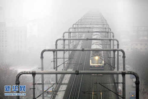 一列火车在南京的雾霾中穿行(1月18日摄)。当节日喜庆的硝烟散尽,全国多地却仍笼罩在阴沉的雾霾之中。重重雾霾加重了人们的疑虑--从“洒水抑尘”到“停工停课”,从“雾霾罚单”到“免职开除”,各地治理雾霾的措施多样、语态坚决,为何效果并不明显?政策在落实中又遭遇了哪些尴尬与问题?突破“十面霾伏”的症结何在?新华社发 王岩棣 摄