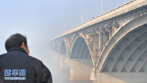 雾霾笼罩下的长沙橘子洲大桥(1月31日摄)。当节日喜庆的硝烟散尽,全国多地却仍笼罩在阴沉的雾霾之中。重重雾霾加重了人们的疑虑--从“洒水抑尘”到“停工停课”,从“雾霾罚单”到“免职开除”,各地治理雾霾的措施多样、语态坚决,为何效果并不明显?政策在落实中又遭遇了哪些尴尬与问题?突破“十面霾伏”的症结何在?新华社记者 龙弘涛 摄