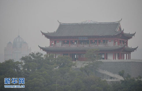 这是位于福州市中心屏山公园内的镇海楼(1月26日摄)。当节日喜庆的硝烟散尽,全国多地却仍笼罩在阴沉的雾霾之中。重重雾霾加重了人们的疑虑--从“洒水抑尘”到“停工停课”,从“雾霾罚单”到“免职开除”,各地治理雾霾的措施多样、语态坚决,为何效果并不明显?政策在落实中又遭遇了哪些尴尬与问题?突破“十面霾伏”的症结何在?新华社记者 魏培全 摄