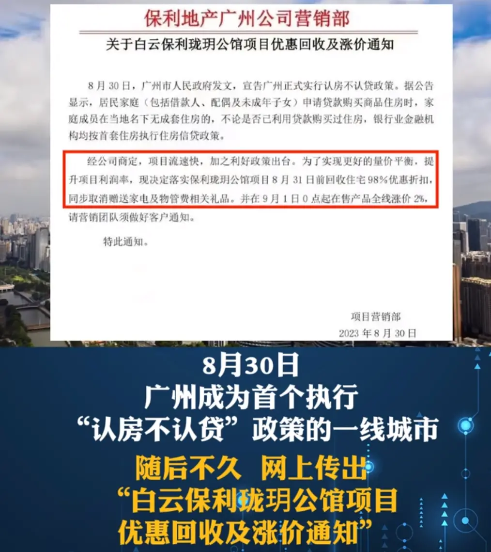 8月30日,广州成为首个执行“认房不认贷”政策的一线城市。据上证报报道,随后不久,网上传出“白云保利珑明公馆项目优惠回收及涨价通知”。对此,保利发展方面回复称:“假的。”