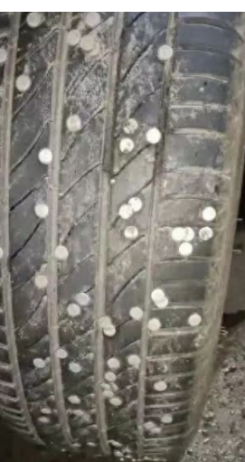 视频截图:网民反映,汽车轮胎上扎了不少图钉。