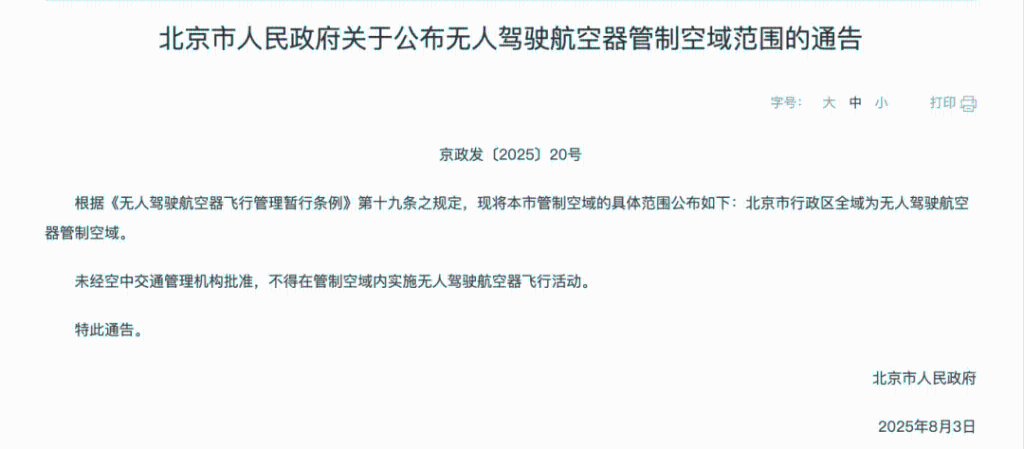 8月4日,北京市人民政府对外发布的《北京市人民政府关于公布无人驾驶航空器管制空域范围的通告》(网络截图)
