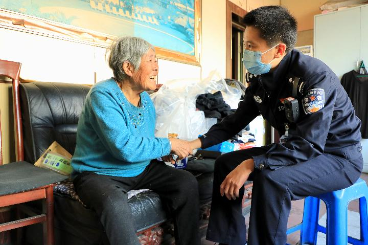 2021年11月,在七台河市桃山区,刘欣走访慰问辖区老人。新华社发(七台河市公安局供图)
