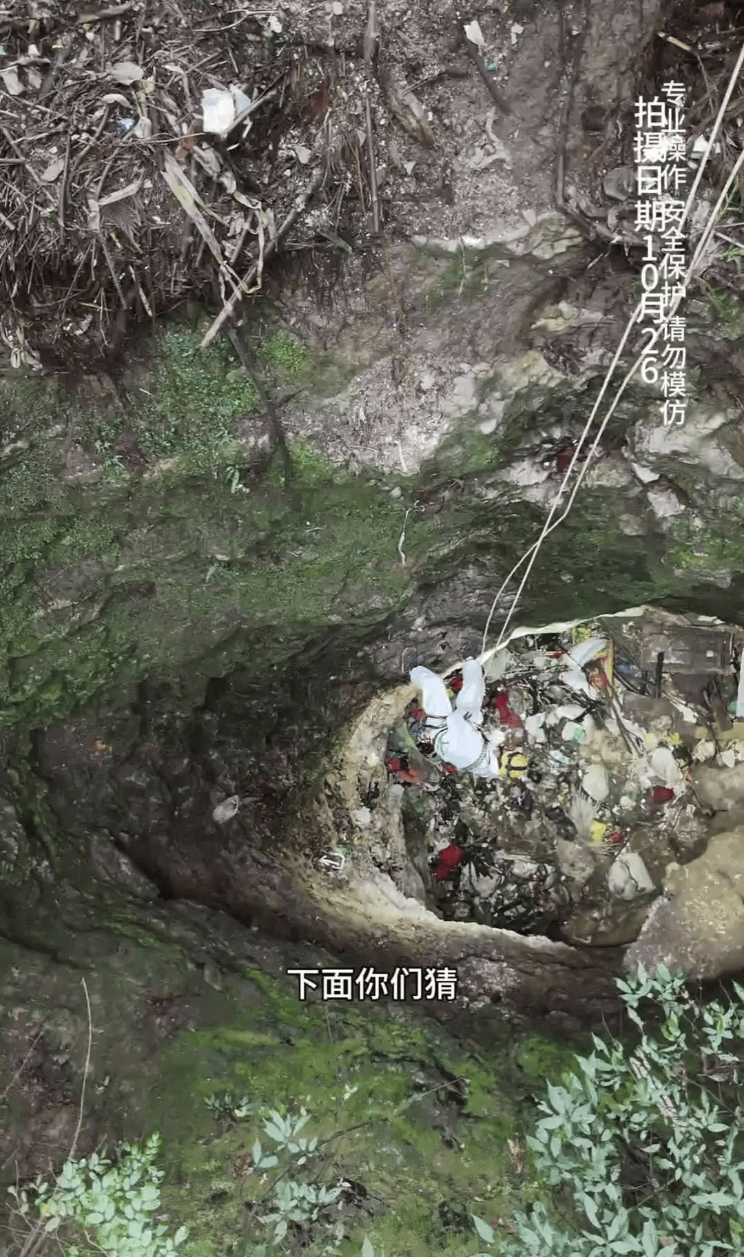 “下面全是死猪,用编织袋装着的,太臭了!还有老鼠在啃食,我们没敢下去,怕有瘟疫。”“小符同志”对封面新闻说,该溶洞洞口直径约两三米,下方空间达十余平方米。