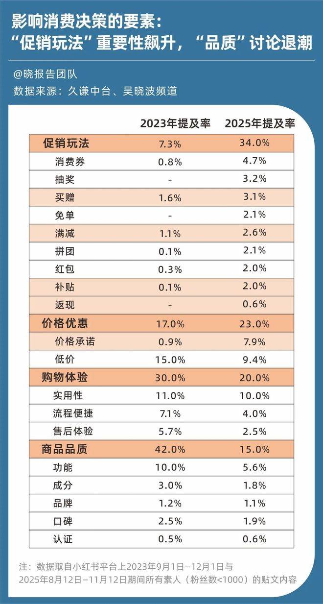 久谦中台数据显示,在社交平台的讨论声量中,“促销玩法”的提及率同比激增近五倍,一举超越“价格优惠”“购物体验”和“商品品质”,成为影响购买的首要因素。其中,“消费券”“抽奖”“免单”“拼团”等游戏化玩法成为焦点。