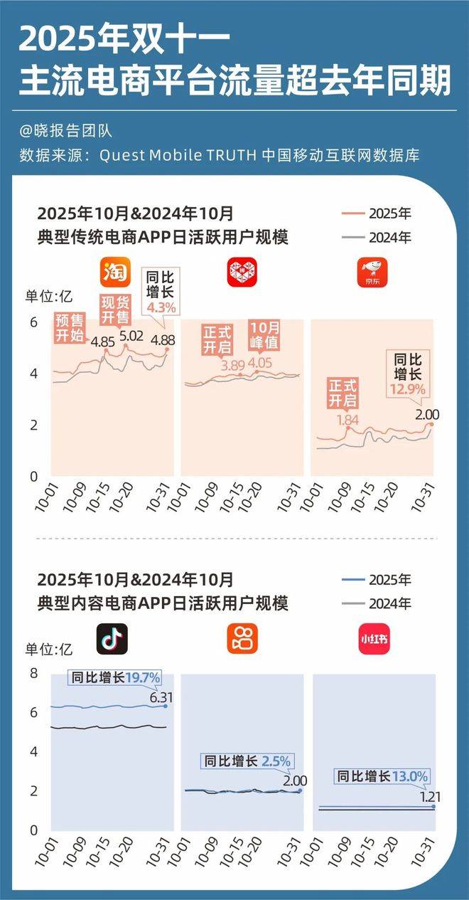 “闪购大战”的势能就此延续到了双十一,为主流电商平台带来了新增量:今年10月,双十一刚开幕,淘宝平台日活用户4.88亿,同比增长4.3%。“京东”也收获了不错的成绩,10月平台日活用户同比增幅达到12.9%。