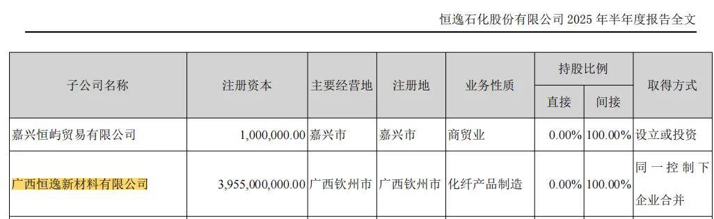 截至2025年上半年,广西恒逸新材料有限公司的注册资本为39.55亿元,注册地为广西钦州市,主要业务为化纤产品相关经营,恒逸石化通过间接持股方式持有该公司100%的股权。