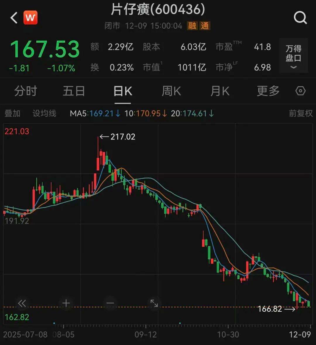 业绩的压力直接反映在股价上。2021年片仔癀市值曾一度突破2900亿元,而截至2025年12月9日收盘,其股价为167.53元/股,已较2021年12月的高点累计跌去超60%,最新总市值1011亿元,已较高点蒸发1889亿元。