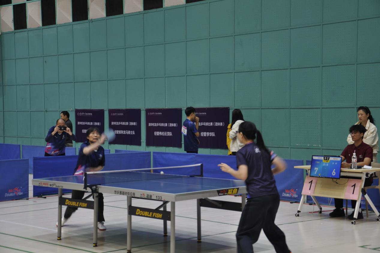 在众多参赛队伍中,清华经管学院的四支劲旅格外引人注目。舜德容大队、伟伦云顶队、紫荆龙马骑士队、李华队,四支队伍各具特色,却同样承载着经管人的风采与担当。参赛选手历经层层选拔脱颖而出,他们中不乏常年活跃在各类乒乓赛事的老将,也有近年崭露头角的新锐力量。赛前,队员们利用业余时间刻苦训练,发球的旋转、接球的落点、战术的配合,每一个细节都反复打磨;赛场上,他们秉持“以球会友、切磋共进,团结协作、勇攀高峰”的原则,以饱满的热情、昂扬的斗志投入每一场对决,用实力诠释着经管人的竞技水准,用行动展现着清华人的精神风貌。