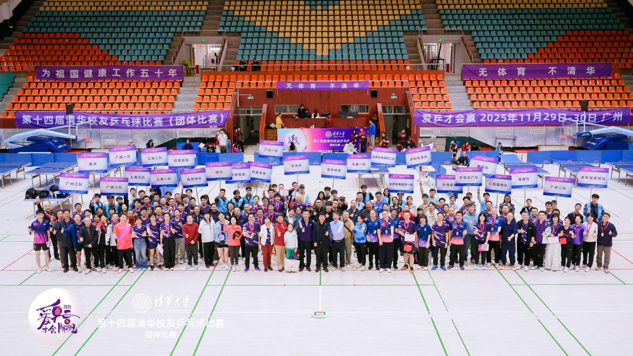 本届赛事由清华校友总会、清华大学体育部联合主办,清华校友乒乓球俱乐部与清华大学广州校友会携手承办,以“银球传情聚校友,砥砺奋进共发展”为核心理念,旨在搭建校友交流的桥梁,传承乒乓运动的魅力,弘扬清华精神的内核。来自全国多个省市的 27 支校友代表队、近200名乒乓爱好者齐聚羊城,他们中既有白发苍苍、年过花甲的老校友,也有朝气蓬勃、刚走出校门的青年才俊;既有深耕实业的行业精英,也有潜心治学的学界翘楚。尽管身份各异、年龄悬殊,但当他们身着统一队服,手握球拍站上赛场,都拥有了同一个身份 ——“清华乒乓人”,都怀揣着同一份热爱 —— 对乒乓的执着,对母校的眷恋。