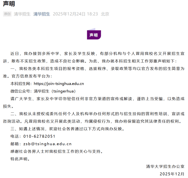 据微信公众号“清华招生”消息,12月24日,清华大学招生办公室发布声明: