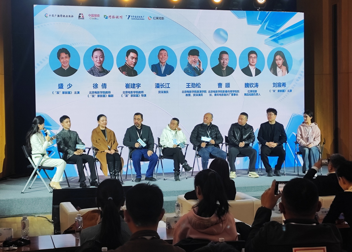 嘉宾对话环节,《“发”家致富》导演崔建宇,编剧徐倩,演员盛少、刘宸希结合创作实践和与会嘉宾就“微短剧精品创作”这一主题展开了深入交流。