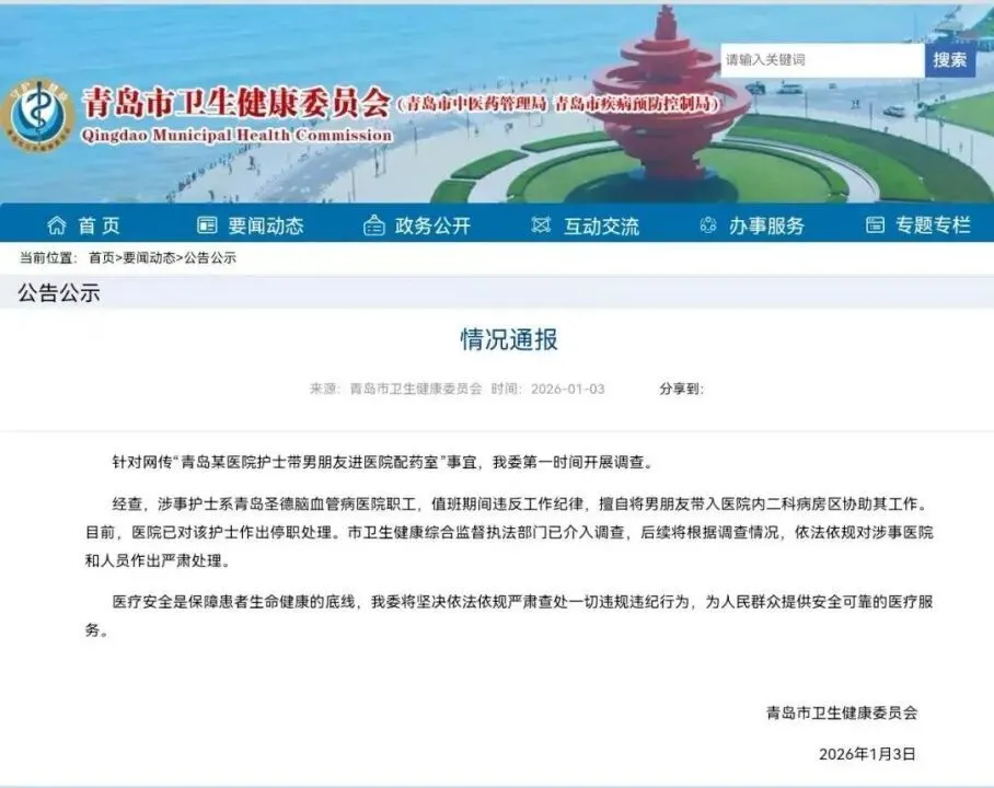 1月3日,山东省青岛市卫生健康委员会针对此事发布情况声明。经查,涉事护士系青岛圣德脑血管病医院职工,值班期间违反工作纪律,擅自将男朋友带入医院内二科病房区协助其工作。目前,医院已对该护士作出停职处理。市卫生健康综合监督执法部门已介入调查,后续将根据调查情况,依法依规对涉事医院和人员作出严肃处理。