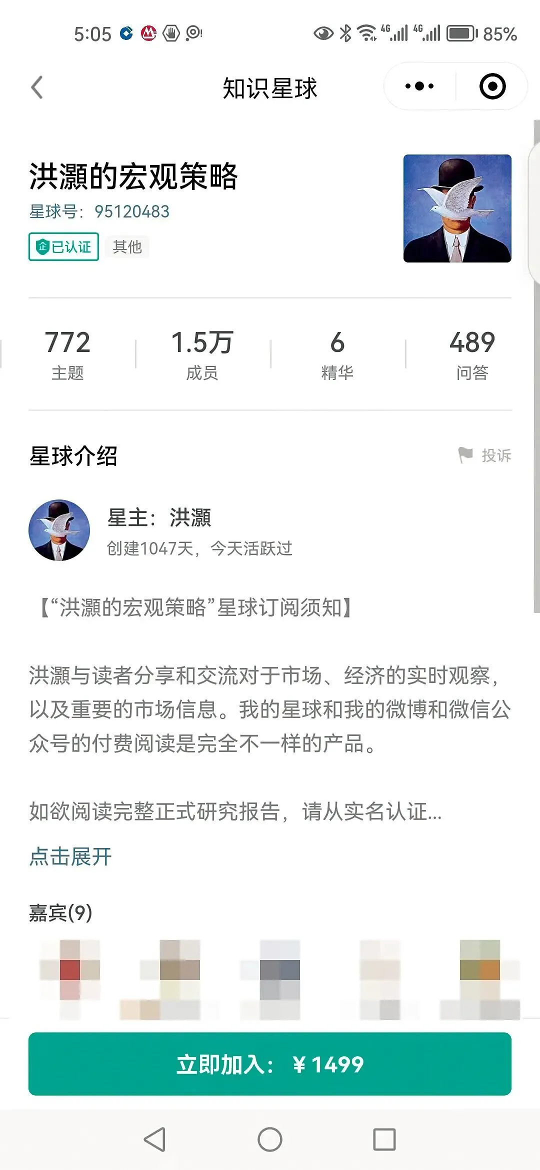 洪灏,曾经在交银国际担任策略主管、在思睿集团担任首席经济学家,如今在知识付费的赛道上跑出了惊人的加速度。他近期在“知识星球”平台开启了高门槛、高定价的宏观策略分享,其付费社群“洪灏的宏观策略”从最开始的899元年费提高到1499元。