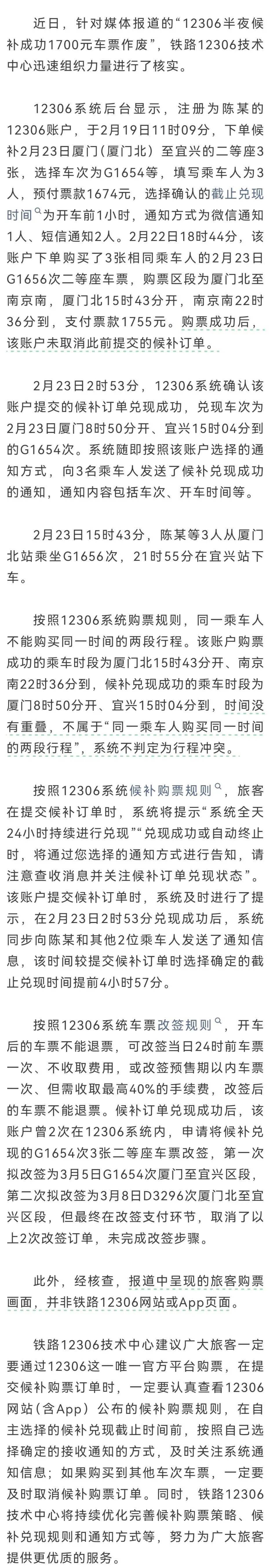 2月25日,铁路部门发文回应“半夜候补成功1700元车票作废”报道: