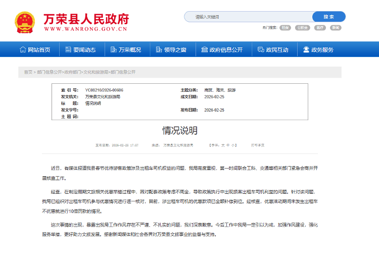 这次事情的出现,暴露出我局工作作风存在不严谨、不扎实的问题,我们深表歉意。今后工作中我局一定引以为戒,加强作风建设,强化服务举措,更好助力文旅发展。感谢新闻媒体和社会各界对万荣县文旅事业的监督与支持。