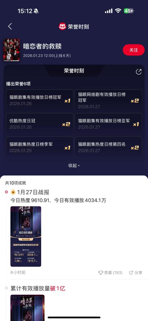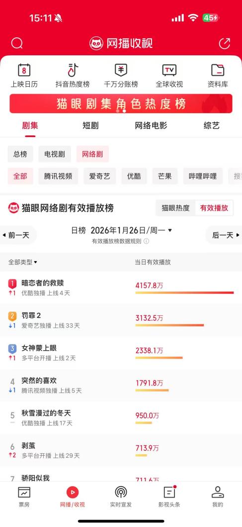 2026年开年,优酷独播剧《暗恋者的救赎》意外引爆影视市场,上线6天累计有效播放破亿,单日最高播放量超4100万,蝉联多日网剧播放量冠军,相关话题持续霸占社交平台热搜。