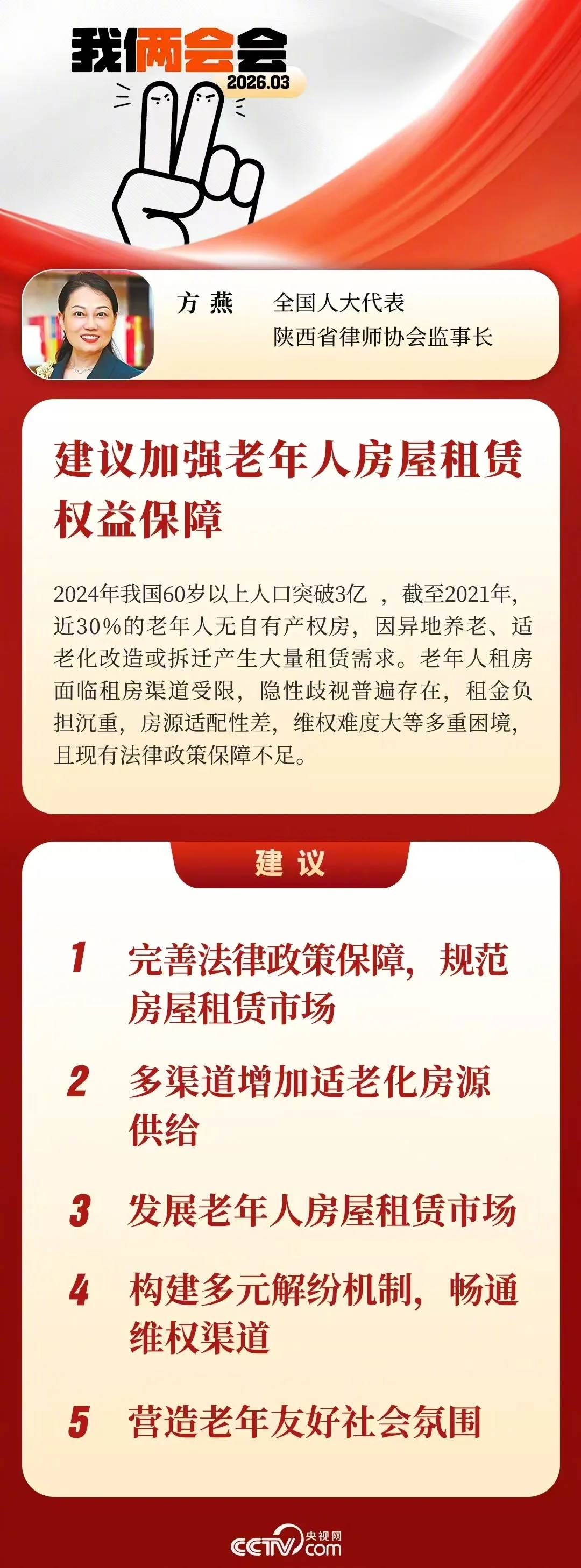 对此,方燕代表建议:将老年人租房权益保障纳入《老年人权益保障法》和《房屋租赁条例》修订,明确禁止年龄、性别、健康方面的歧视,细化租赁合同保障条款;推出适老化租赁合同示范文本;增加适老化房源供给,加快适老化改造,扩大补贴范围;建设老年人租房信息化平台;畅通维权与解纷机制,建立诉调对接绿色通道,强化检察支持起诉与公益诉讼,扩大法律援助覆盖;营造老年友好社会环境,加强宣传引导,消除社会偏见。