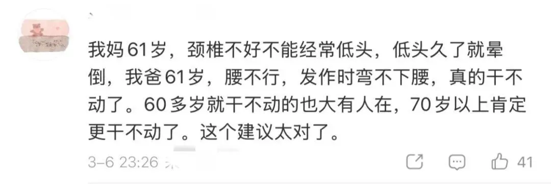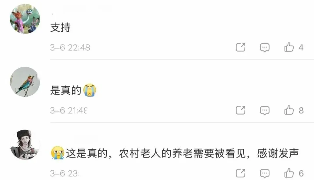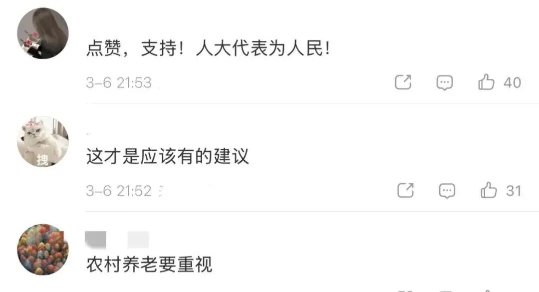 评论区网友们交流起各地农村的养老现状,并为郭庆莉代表的发声点赞。
