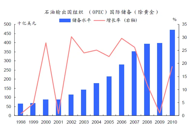 在经济全球化的今天,这种分析容易高估油价上升的影响。油价上升本身代表的是全球收入的再分配(而不是减少),收入从石油进口国转移到石油出口国。这可能产生两个效果:1)石油出口国收入增加导致从其他国家进口的商品和服务增加;2)石油出口国收入增加的另一部分变为财富积累,通过资本流动回到石油进口国,宽松了这些国家的融资条件,部分抵消油价上升的负面影响。2003-2007间油价上升是个明显的例子:一方面是石油输出国进口增速加快,尤其是中国等制造业新兴市场国家对OPEC国家出口增加(图表1);另一方面是OPEC国家外汇储备也大幅增加,回流到美国和欧洲国债,是国债收益率维持在低位的一个重要因素(图表2)。