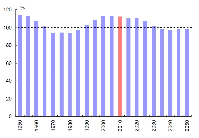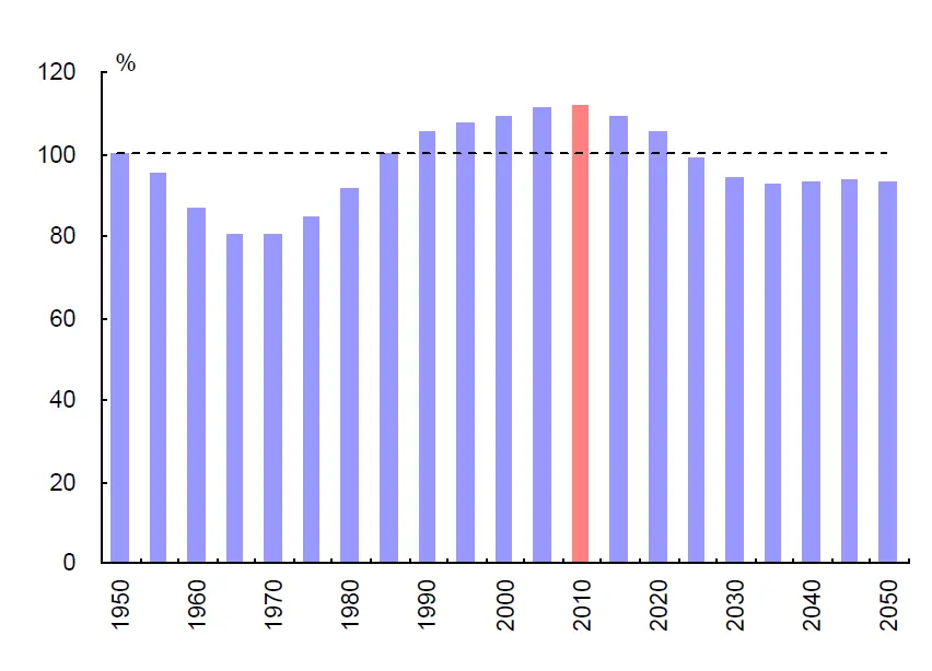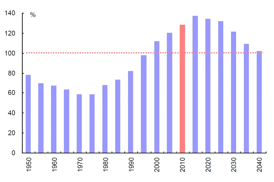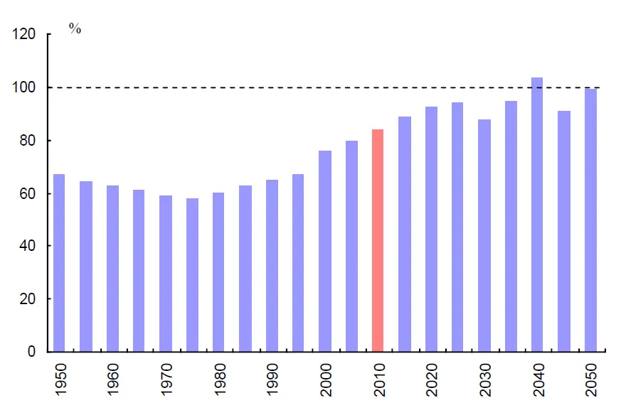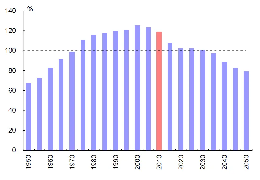 在考虑这种尾部风险(tail risk)时,我们需要注意现在和70年代的一个重大差别。也就是现在全球经济供给比较充分,而70年代是短缺型的经济。在总体供给较充分的情况下,供给冲击和油价上升导致通胀失控的可能性小。我们可以从主要经济体的人口结构来看这个问题。我们把年龄在25-64岁的人看成是生产者,25岁以下和64岁以上的定义为净消费者,然后比较这两组人口数目的大小。图表3-8显示了主要发达国家(美、英、德、日)和中国、印度的生产者相对于净消费者的比率。2010年美、英、德、日和中国的生产者数目显著超过净消费者,尤其是中国和德国。这样的情形在中国是过去10年的事,美、英、德已持续20年,日本已有30年。而在70年代,发达国家的生产者小于消费者数目,尤其是美国,现在的比率是110%左右,而在70年代只有80%左右。印度现在比率只有80%,但比70年代的60%还是有较大改善。