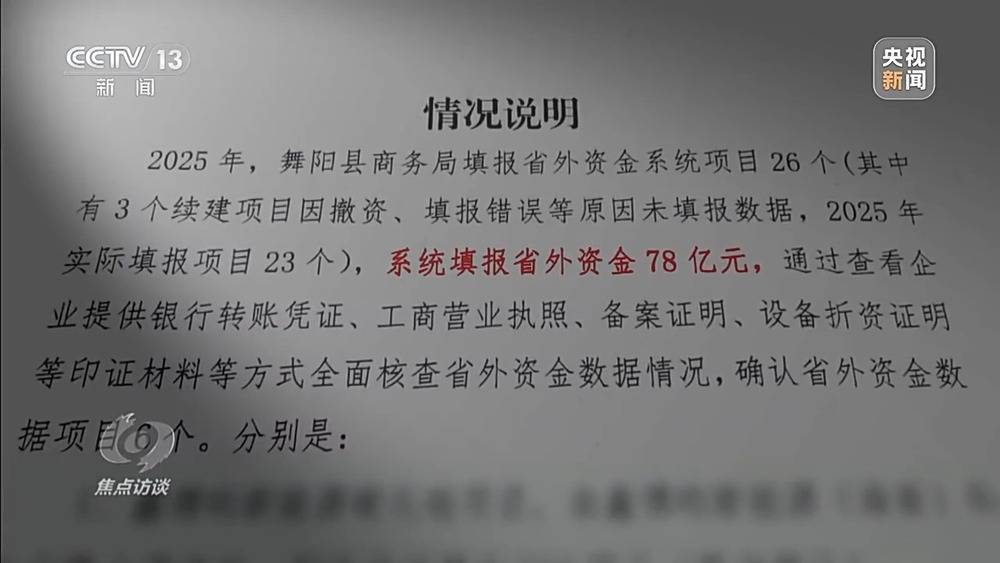 省外资金,简单来说就是从本省以外地区引进来的投资资金。2000年前后,我国多地开始将引进省外资金作为推动区域发展的重要抓手,一些省份将引进省外资金作为加快发展的关键举措,开始建立省外资金统计通报与排名机制,省际围绕项目、资源、政策展开激烈竞争。在这一过程中,部分地方出现了省外资金统计严重失真失实的情况。2025年1月到11月,河南省漯河市舞阳县上报省外到位资金78亿元,但当记者调查时,当地承认实际到位金额仅为1亿多元。