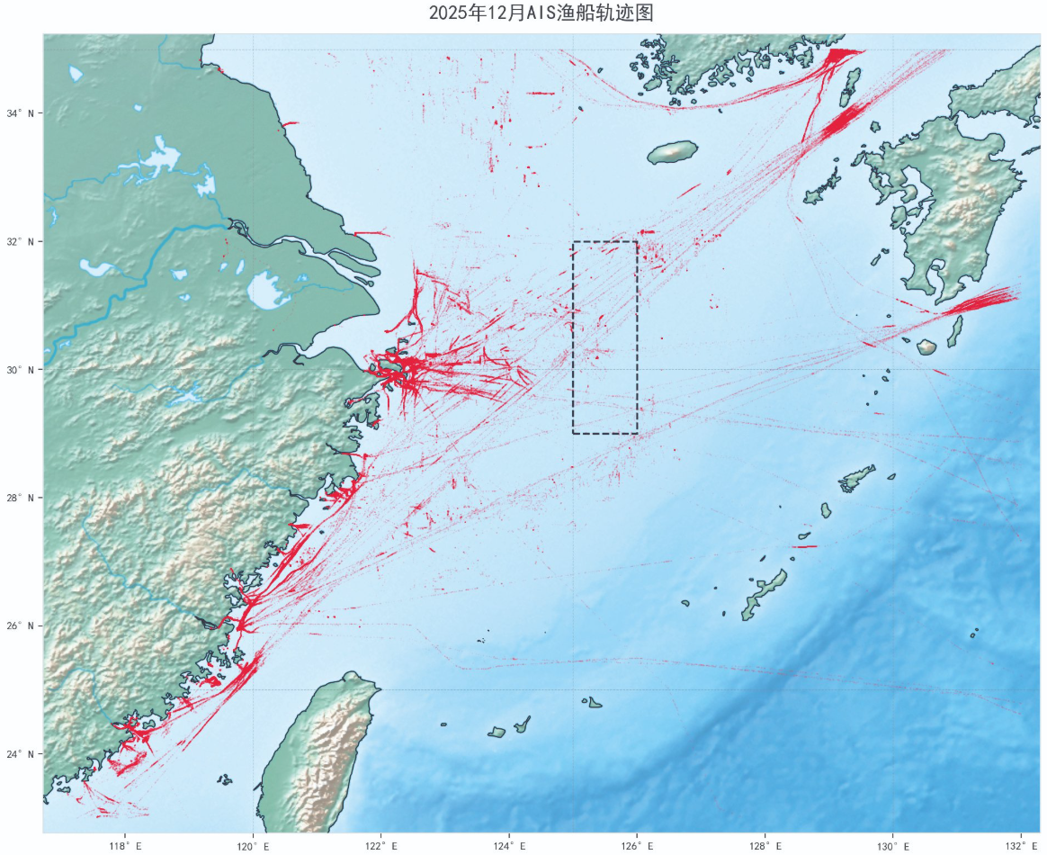 上海海洋大学数据中心提供给《环球时报》记者的一幅数据图则显示,外媒报道中,2025年12月“上千艘中国渔船在某一海域集结成两列数百公里‘平行队形’”的情况并不存在。该中心通过中国渔船的AIS数据绘制的中国近海渔船AIS分布热点图中,在外媒报道划定的区域中,并未出现渔船密集聚集的情况。