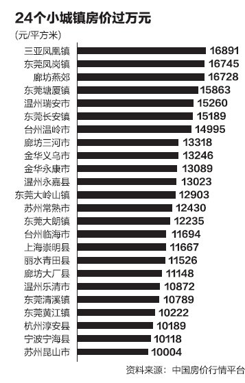 《第一财经日报》记者根据中国房价行情平台发布的全国小城镇房价排行榜统计发现,已有24个小城镇的房价突破万元大关,这些小城市主要包括两类,一类是环深圳、上海和北京三大一线城市周边,由于一线城市购买力外溢所带来的房价上涨。另一类主要是浙江板块的很多县城(县级市),前几年浙江房价整体上涨较快,基数较高,近些年房价实则较为平稳。
