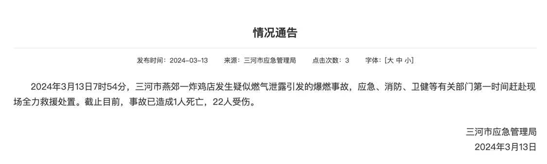 2024年3月13日7时54分,三河市燕郊一炸鸡店发生疑似燃气泄露引发的爆燃事故,应急、消防、卫健等有关部门第一时间赶赴现场全力救援处置。截止目前,事故已造成1人死亡,22人受伤。