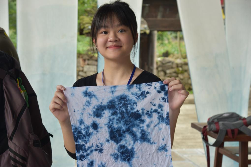 在体验扎染时,香港宁波第二中学学生黄宇彤对以板蓝根制作的植物染料很感兴趣。“之前只听说过板蓝根是一种中药材,没想到仡佬族还用作染料,既保留了大自然的颜色,也很生态环保。”在展示亲手印染的作品时,她很喜欢植物印染后布料上残留的淡淡清香。