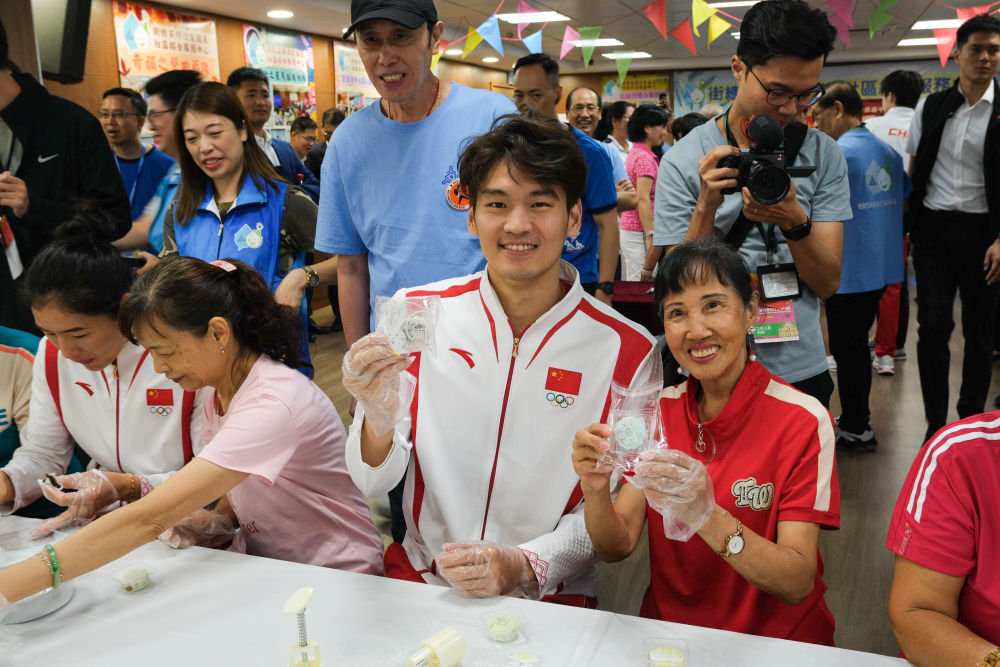 中秋节将至,石排湾社区居民还与奥运健儿们一起制作了冰皮月饼。居民陈舜兰说,游泳运动员徐嘉余教她压模具力度大一点,表示“是我跟他学”。跳水运动员谢思埸说,做好的月饼要“带回去给我太太”。乒乓球运动员王楚钦当起“月饼品鉴师”:“广式月饼比北方的粘牙,比想象中好吃。”