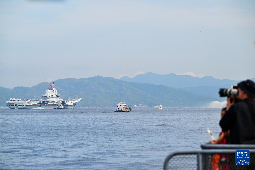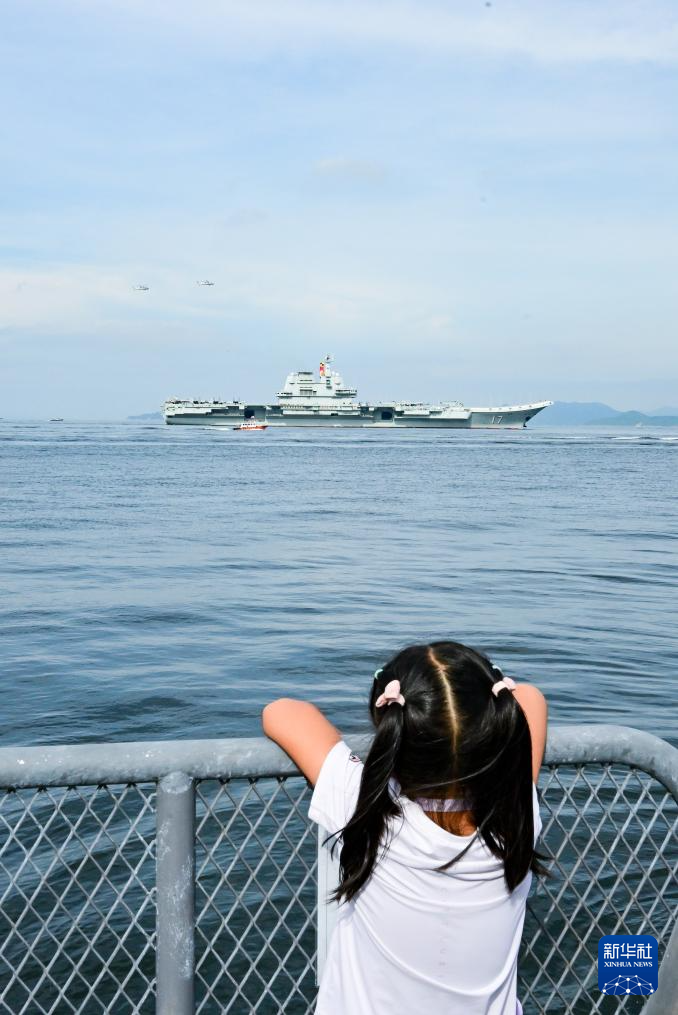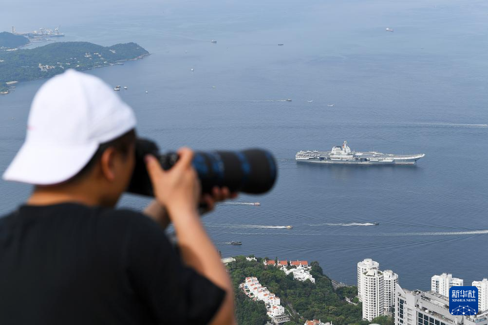7月3日,人们在岸上拍摄海军山东舰抵达香港。