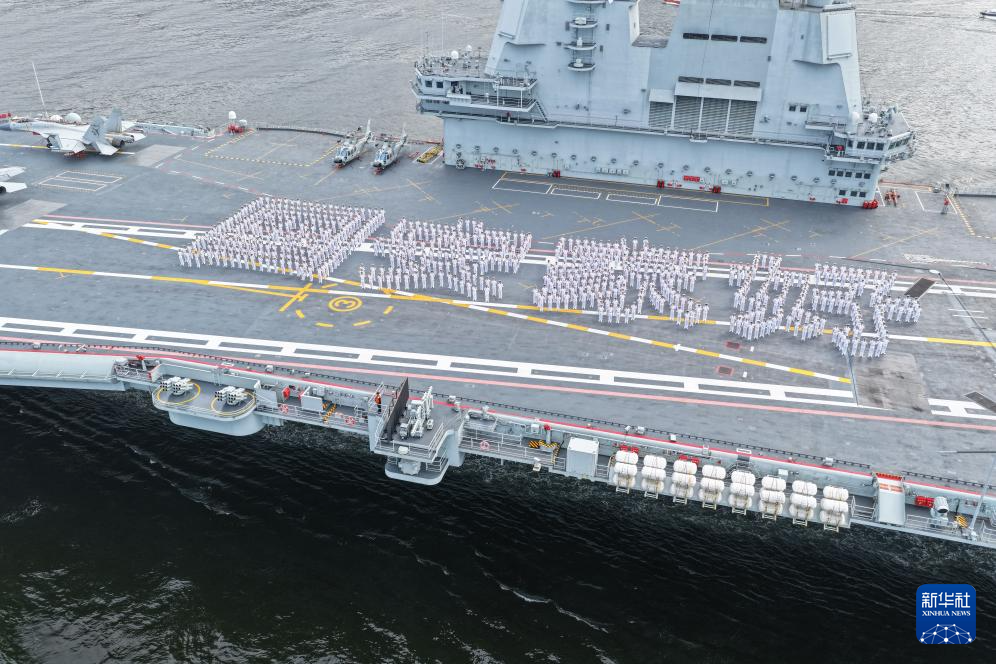 7月3日,中国海军山东舰航母编队抵达香港。这是山东舰官兵在飞行甲板上列队排出“国安家好”字样(无人机照片)。