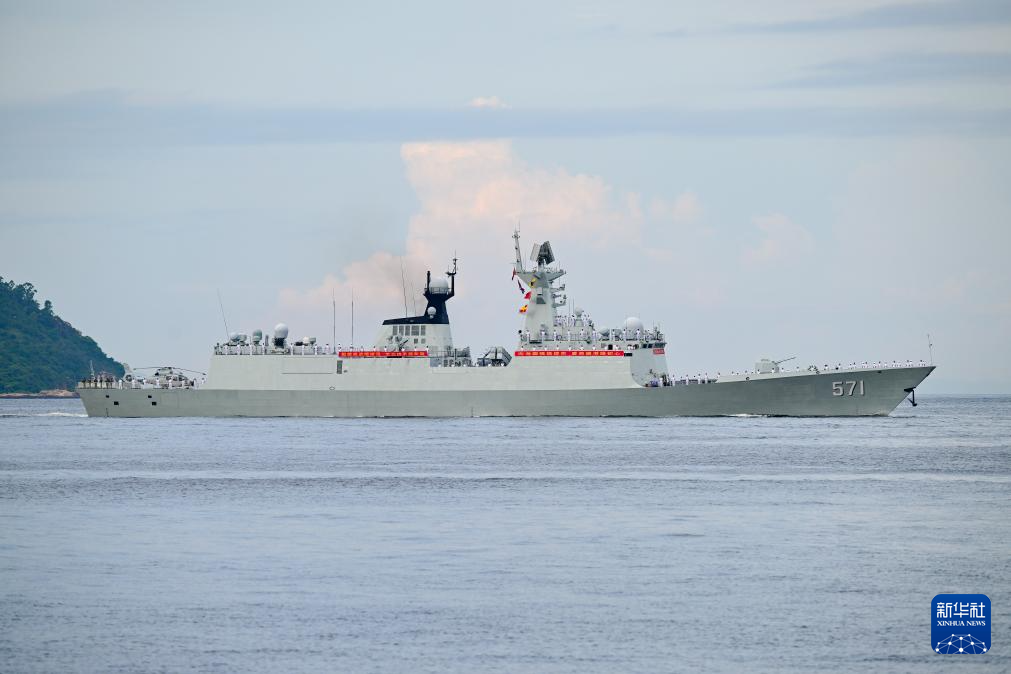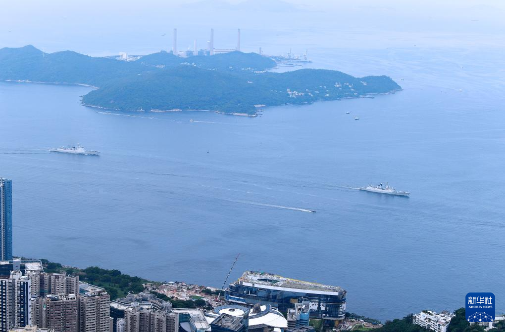 7月3日,海军运城舰(右)和湛江舰行进在香港水域。